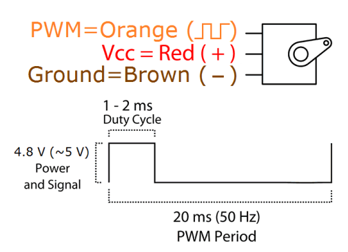 - Kết nối dây màu đỏ với 5V, dây màu nâu với mass, dây màu cam với chân phát xung của vi điều khiển. Ở chân xung cấp một xung từ 1ms-2ms theo để điều khiển góc quay theo ý muốn.